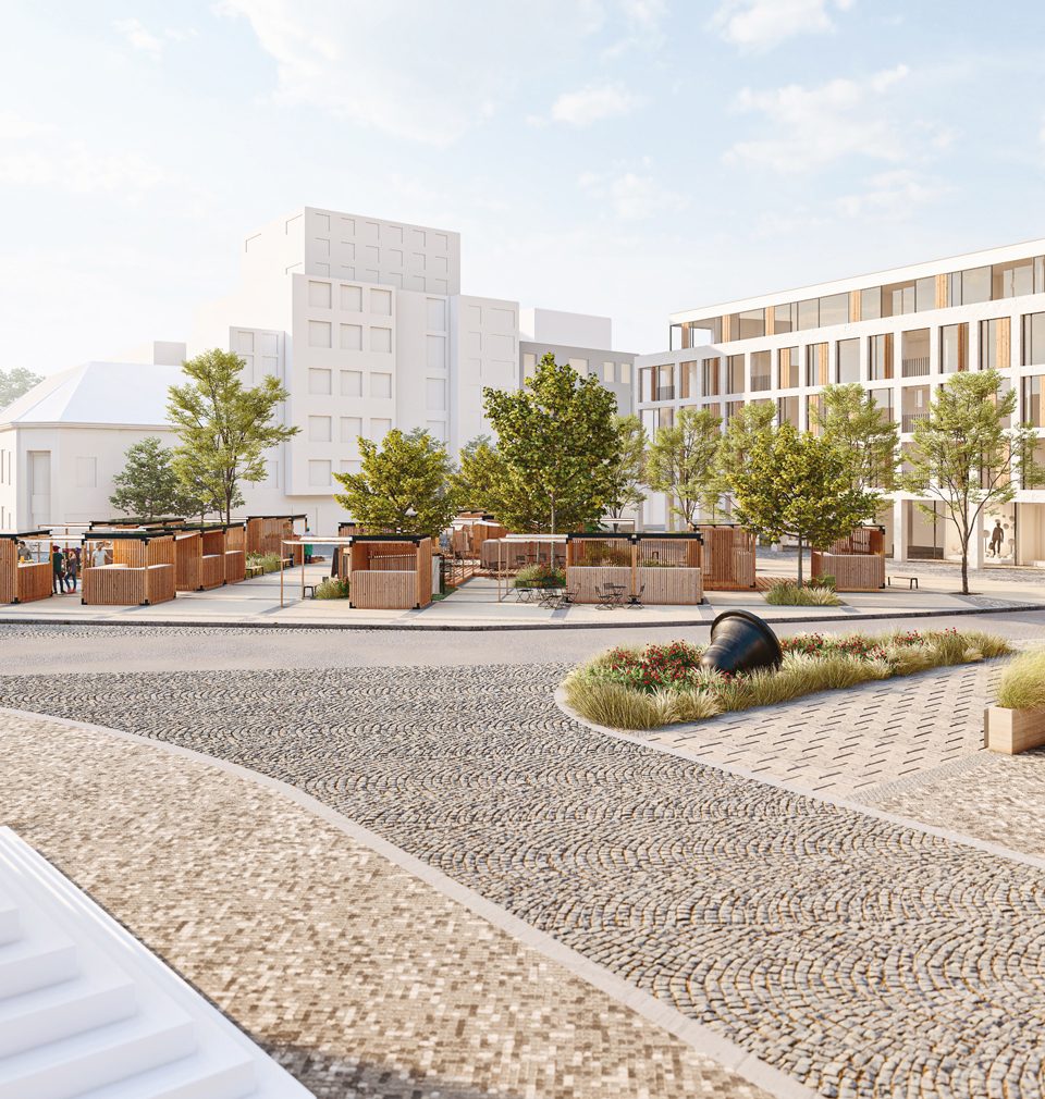 Centrální část náměstí jsme navrhli jako rozehranou šachovou partii volnočasových příležitostí a zeleně. Rast šachovnice se formálně promítl do velkoformátového dláždění. Místo hracích figurek jsme na šachovnici příhodně umístili zelené plochy a posezení, které doplní variabilní přístřešky nejrůznějších stánků. Důvtipné, přitom však racionální řešení náměstí doplní i dva citlivě upravené vstupu krytu civilní ochrany, který rozšíří veřejný prostor náměstí o netradiční podzemní kinosál, alternativní divadelní scénu nebo vinárnu.