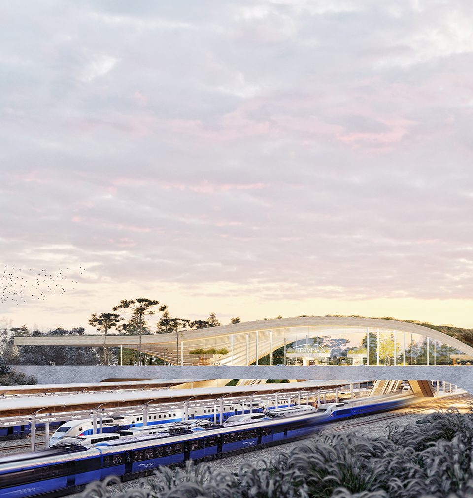 Páteří rozvojového území formovaného kolem navrženého dopravního terminálu prvního vysokorychlostního úseku železnice v Česku – Praha Východ je struktura kvalitního dopravního veřejného prostoru, obsluhujícího administrativní budovy, prostory pro nerušící a drobnou výrobu i obchodní centra. Návrh přináší logické provozní a dopravní řešení a vytváří nové vazby v lokalitě napojené na dopravní terminál. Jeho dynamická architektura zaujme elegantními křivkami i funkčním dispozičním řešením pro maximální komfort a snadnou orientaci cestujících. Rozvojová zóna navazuje na přívětivou krajinu propojující městys Nehvizdy, obci Vyšehořovice, Horoušany a Jirny. Pobytové louky, přehledné stezky a lesoparky vybídnou ke sportovním aktivitám, procházkám, rekreaci a odpočinku.