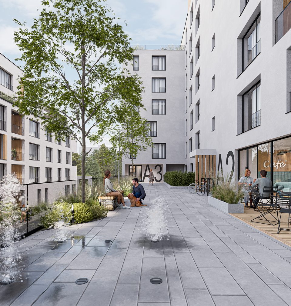 Kde přesně nová čtvrť vznikne Vám zatím nesmíme prozradit, ale sledujte nás a brzy se dozvíte víc. Kompozice obytných domů se zelenými střechami, prostornými terasami, balkony a lodžiemi vyrůstá ze společné zahrady, kde své místo nalezly jednak soukromé předzahrádky bytů v prvním podlaží a jednak společné zálivy pro posezení, komunitní zahrádky a dětská hřiště pro majitele nových nízkoenergetických bytů různých kategorií. Pro rekreaci a zpříjemnění volného času jsme do lokality zakomponovali i novou kavárnu s venkovní zahrádkou nebo menší náměstí.